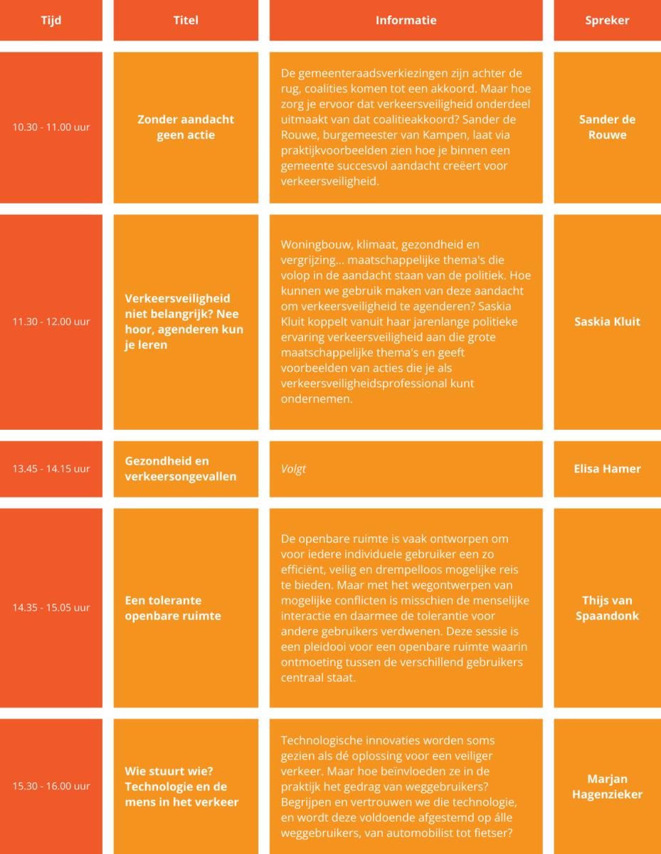 Dit jaar kiezen we voor een unieke aanpak: in plaats van één keynote, presenteren we maar liefst vijf inspirerende keynotes tijdens het Nationaal Verkeersveiligheidscongres. De keynotes zorgen voor inspiratie en prikkelende visies.
